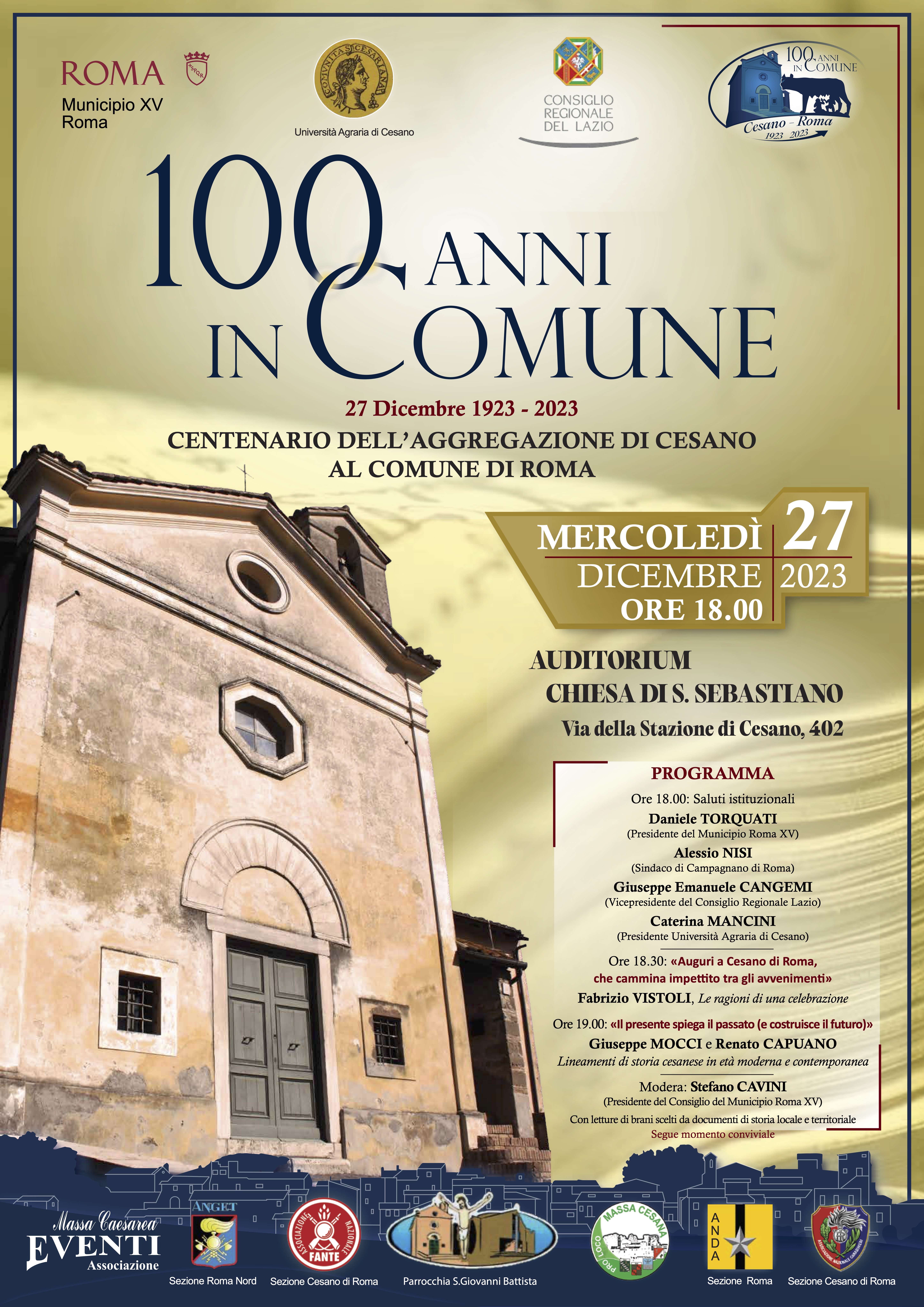 Mercoledì 27 dicembre 2023, a partire dalle ore 18.00, presso l’Auditorium della Chiesa di San Sebastiano di Cesano di Roma (Via della Stazione di Cesano, 402) si terrà l’evento di rievocazione dello scorporo di Cesano dal Comune di Campagnano e contestuale aggregazione a quello di Roma, condizioni sancite con Regio Decreto 27 dicembre 1923, n. 3247. Nell’occasione verranno illustrati i risultati preliminari di numerose ricerche in corso in grado di lumeggiare la storia di Cesano di Roma durante l’età moderna e contemporanea (periodo nel quale il territorio afferente all’antico centro si è strutturato dal punto di vista urbanistico ed edilizio, e qualificato sotto il profilo demografico) e al contempo presentate le manifestazioni culturali che lungo l’intero anno 2024, a cura di un Comitato appositamente costituito, saranno localmente dedicate a questa importante ricorrenza anniversaria.