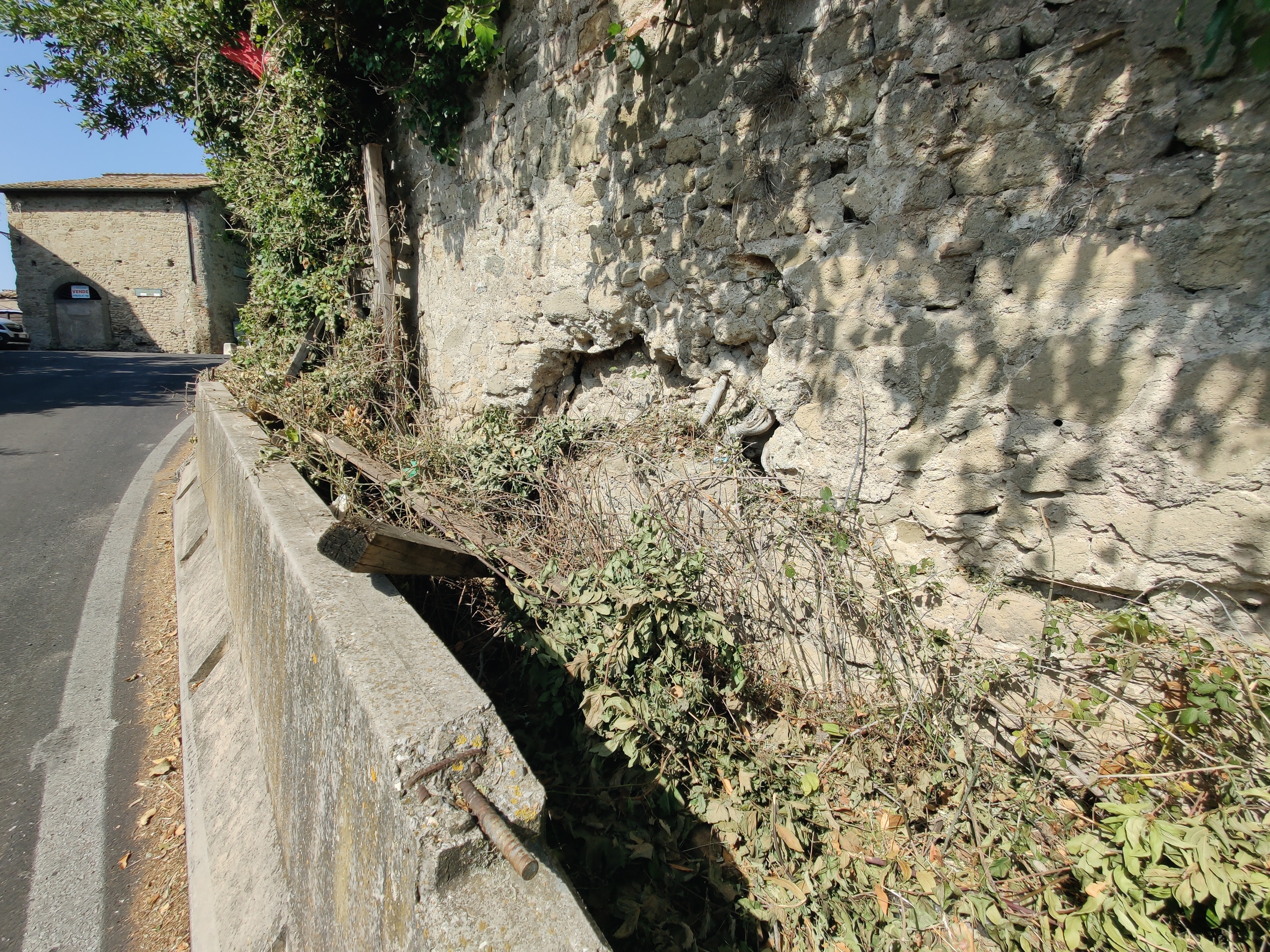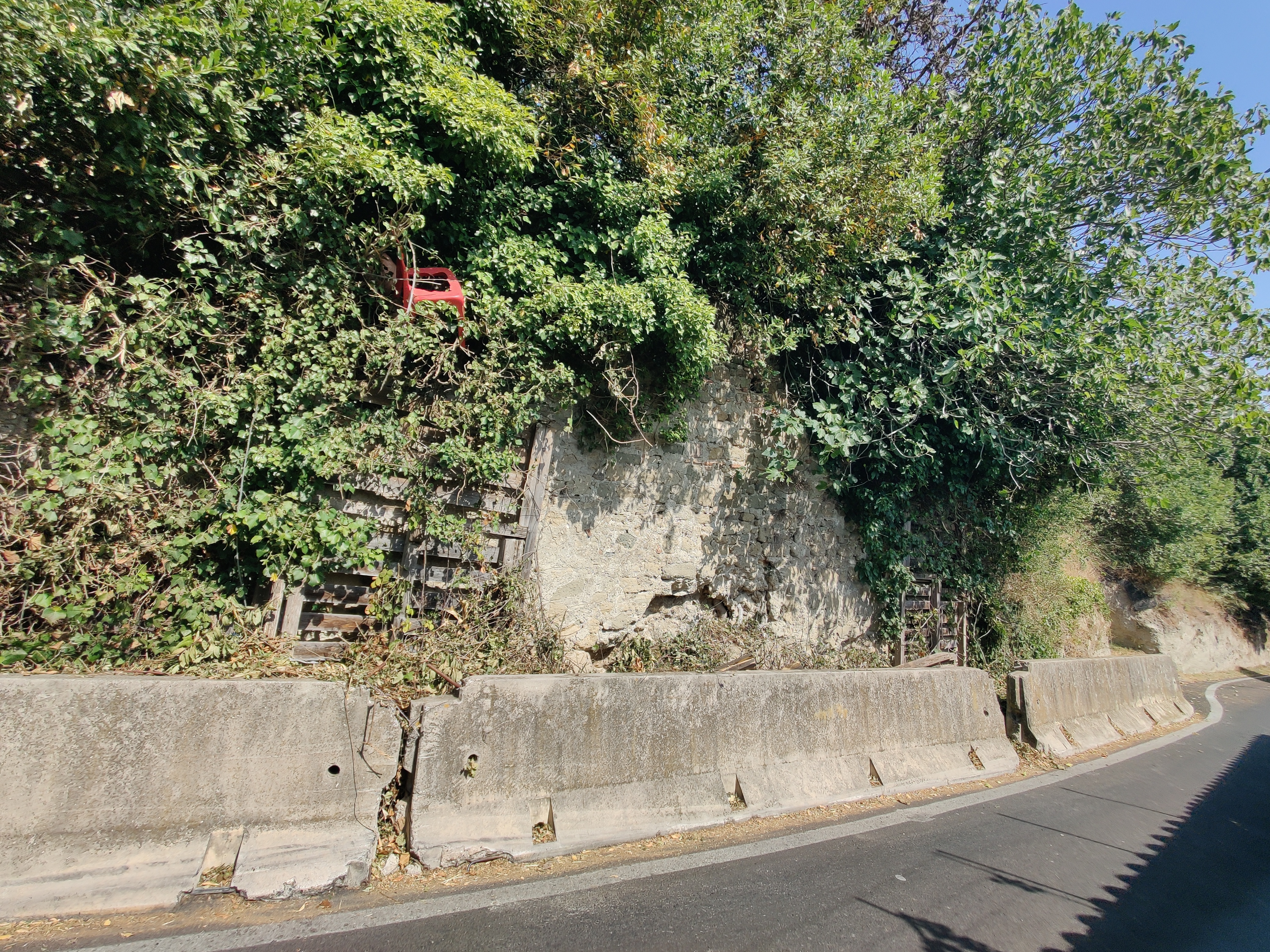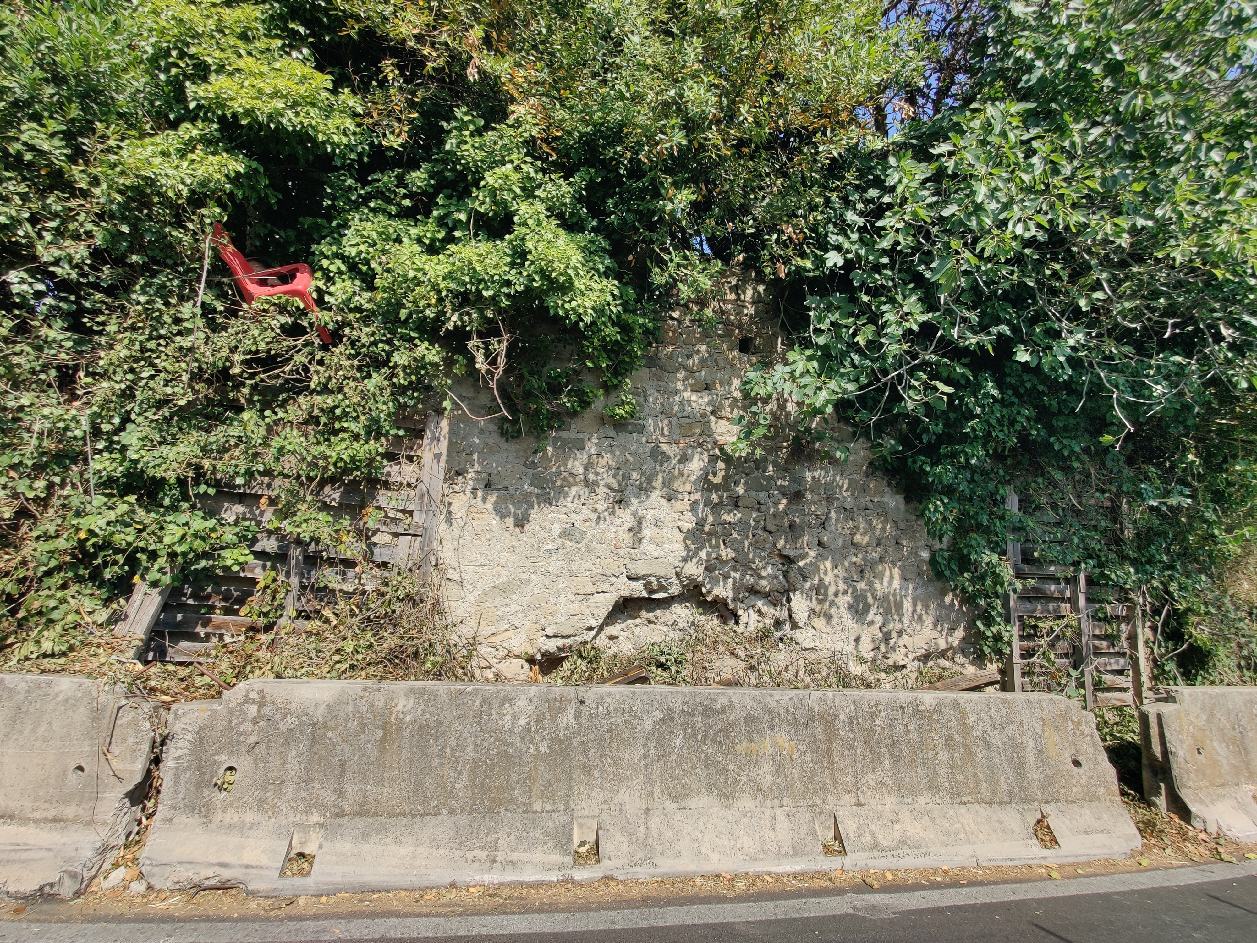 Il bene veniva allora protetto da impalcature in legno che avevano l'aria di essere provvisorie, propedeutiche per un successivo intervento per consolidarlo e renderlo fruibile agli occhi di tutti noi, dei pellegrini e camminatori della Via Francigena e dei visitatori dell'antico borgo storico di Cesano alle porte di Roma, come la professoressa Gorlani definiva il paese di Cesano, dal 1923 facente parte del Comune della Capitale d'Italia, ora parte del XV Municipio. Successivamente venivano aggiunte delle barriere jersey per ulteriore protezione del bene. Che però è rimasto così per tutti questi anni, ricoprendosi ancora di più da frasche, rampicanti e fronde nascondendo tutto l'insieme alla vista di chiunque.