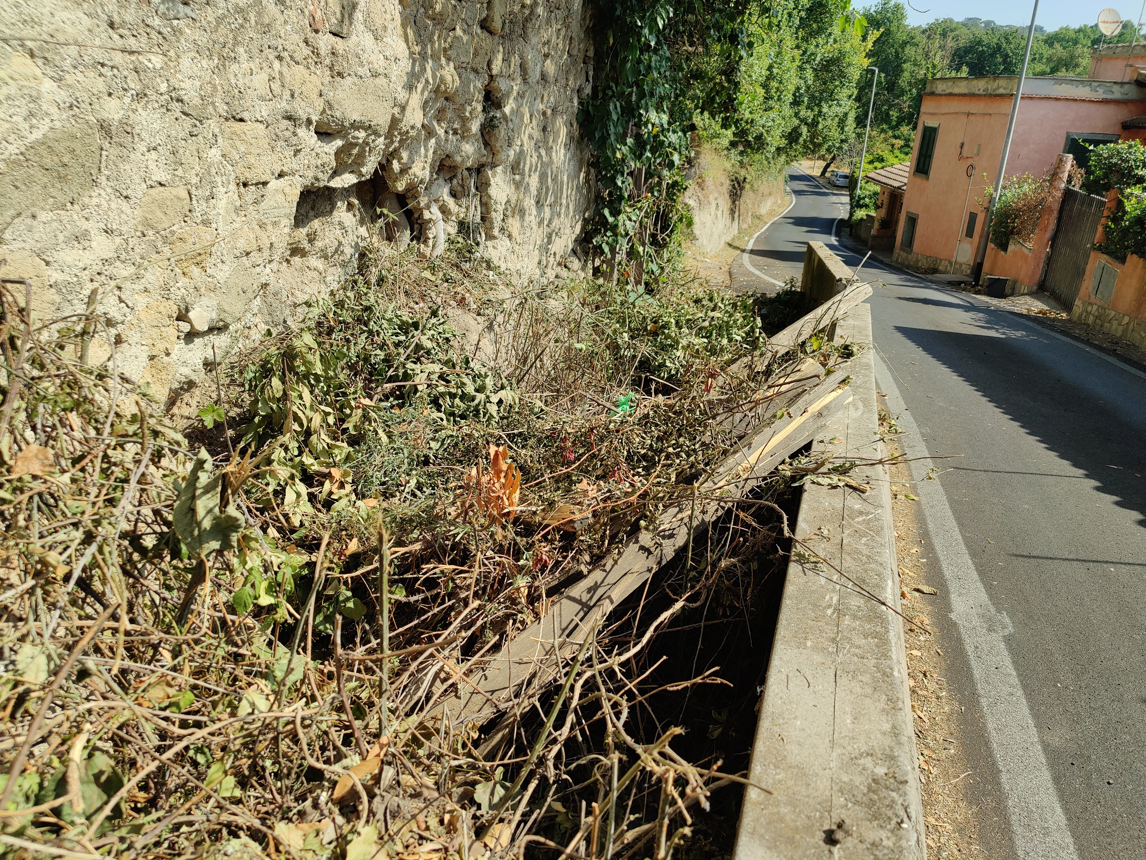 Giorni fa i bordi della strada non stati falciati e così sono venuti alla luce alcuni danni: la crepa, già presente nel 2008, si è n po' ingrandita, mentre una delle barriere in legno è rovinosamente crollata su se stessa.