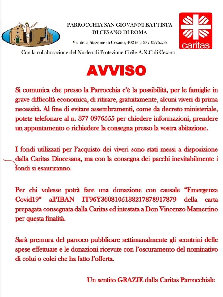 A Cesano da anni, presso la Parrocchia San Giovanni Battista, è presente la Caritas con i suoi volontari. Da sempre consegnano pacchi gratuitamente a chi è in difficoltà e in questa situazione emergenziale la Caritas Diocesana ha stanziato dei fondi per aiutare un maggior numero di persone. Chiunque si trovi in difficoltà sin da subito può contattare il numero telefonico presente nella locandina così come chi voglia contribuire facendo una donazione, vi può trovare tutti i riferimenti utili.