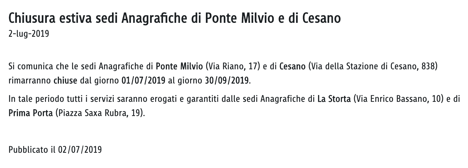 «Si comunica che le sedi Anagrafiche di Ponte Milvio (Via Riano, 17) e di Cesano (Via della Stazione di Cesano, 838) rimarranno chiuse dal giorno 01/07/2019 al giorno 30/09/2019.