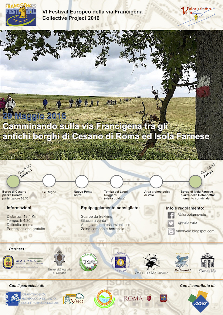 Infatti, l'associazione Valorizziamo Veio, sotto l'egida dell'Associazione Europea delle Vie Francigene, e con il patrocinio degli Enti Regionali Parco di Veio e Bracciano/Martignano, del Municipio Roma XV e di ACEA SpA, terrà a battesimo - il giorno 29 maggio 2016 (domenica) - una "nuova" variante della via Francigena Nord, organizzando un'escursione collettiva tra i Borghi storici di Cesano di Roma ed Isola Farnese. L'evento, alla cui realizzazione collaboreranno numerose Istituzioni, Enti e Associazioni locali (Soprintendenza Archeologia del Lazio e dell'Etruria Meridionale, Comune di Formello, Università Agraria di Cesano, Pro Loco Massa Cesana, Terre di Veio, Mediterraid, Ostello Maripara di Formello ecc.), è stato inserito nel programma del festival Europeo della Via Francigena – Collective Project 2016, e prevede l'arrivo alla meta dopo un percorso di circa 14 km da coprire in 4.30 ore di cammino, con transito presso la tomba etrusca dei Leoni Ruggenti (la più antica sepoltura dipinta del Mediterraneo Occidentale) e nell'area archeologica di Veio (zona Campetti). Al termine dell’iniziativa seguirà un momento conviviale presso il Borgo di Isola Farnese.