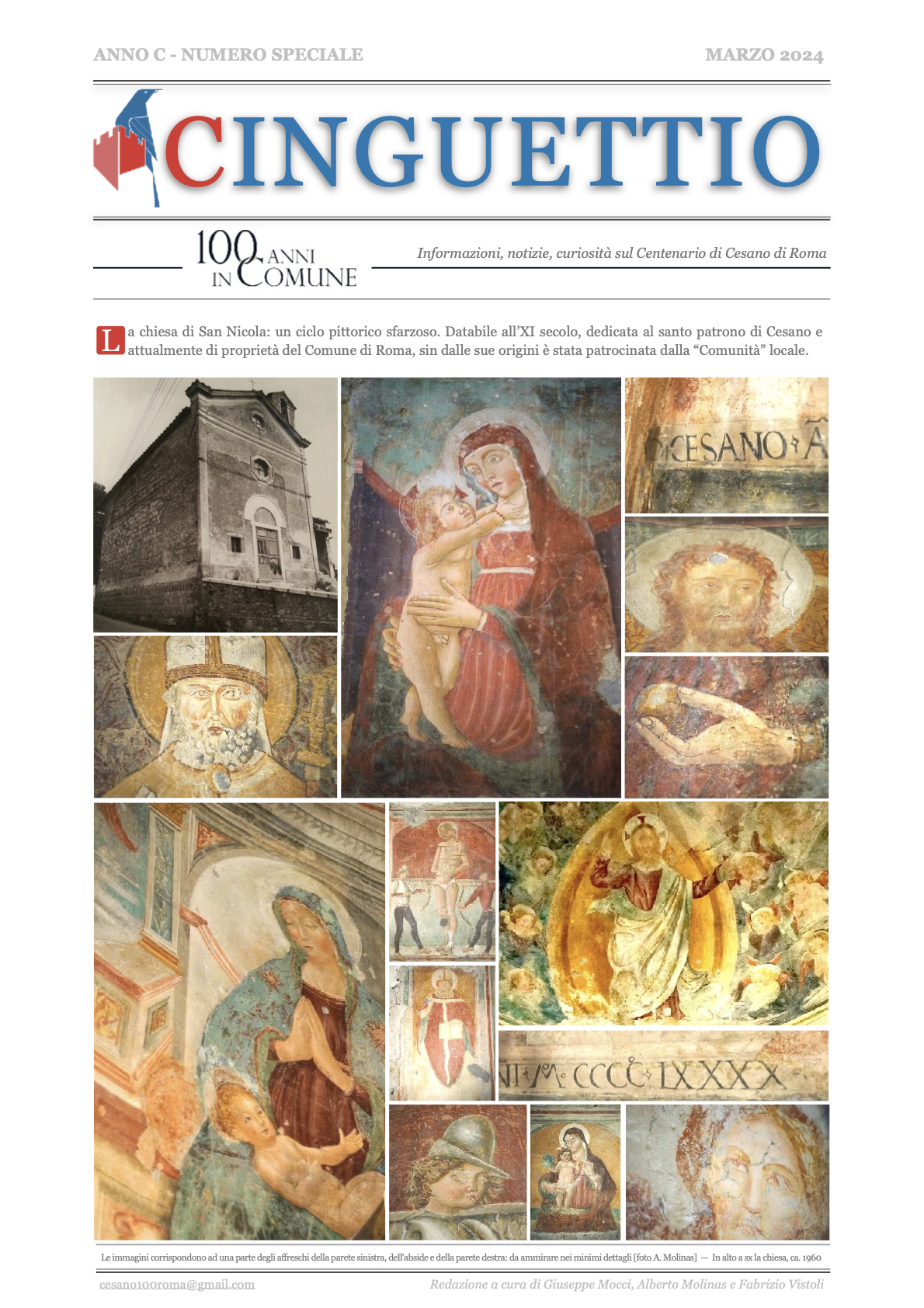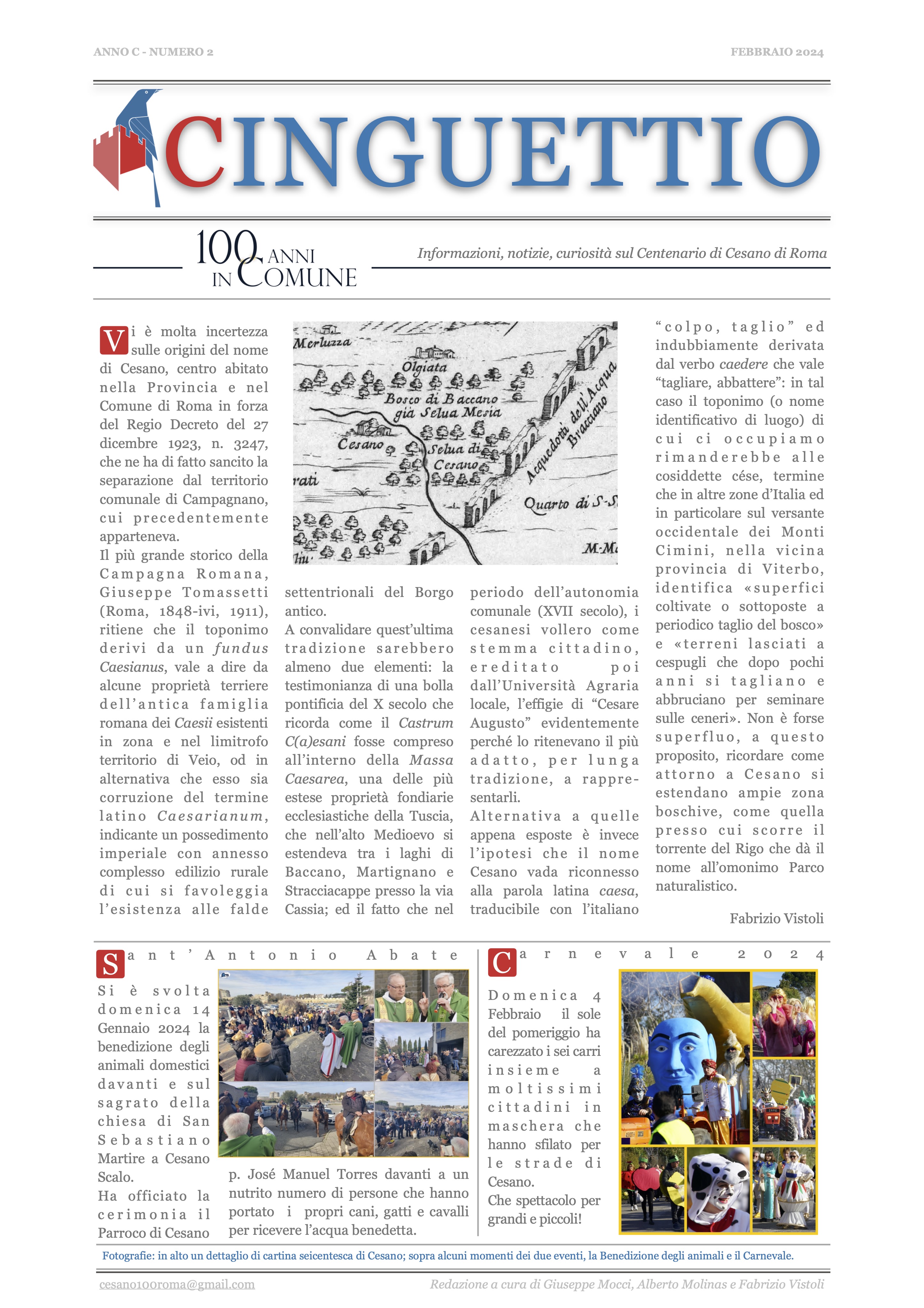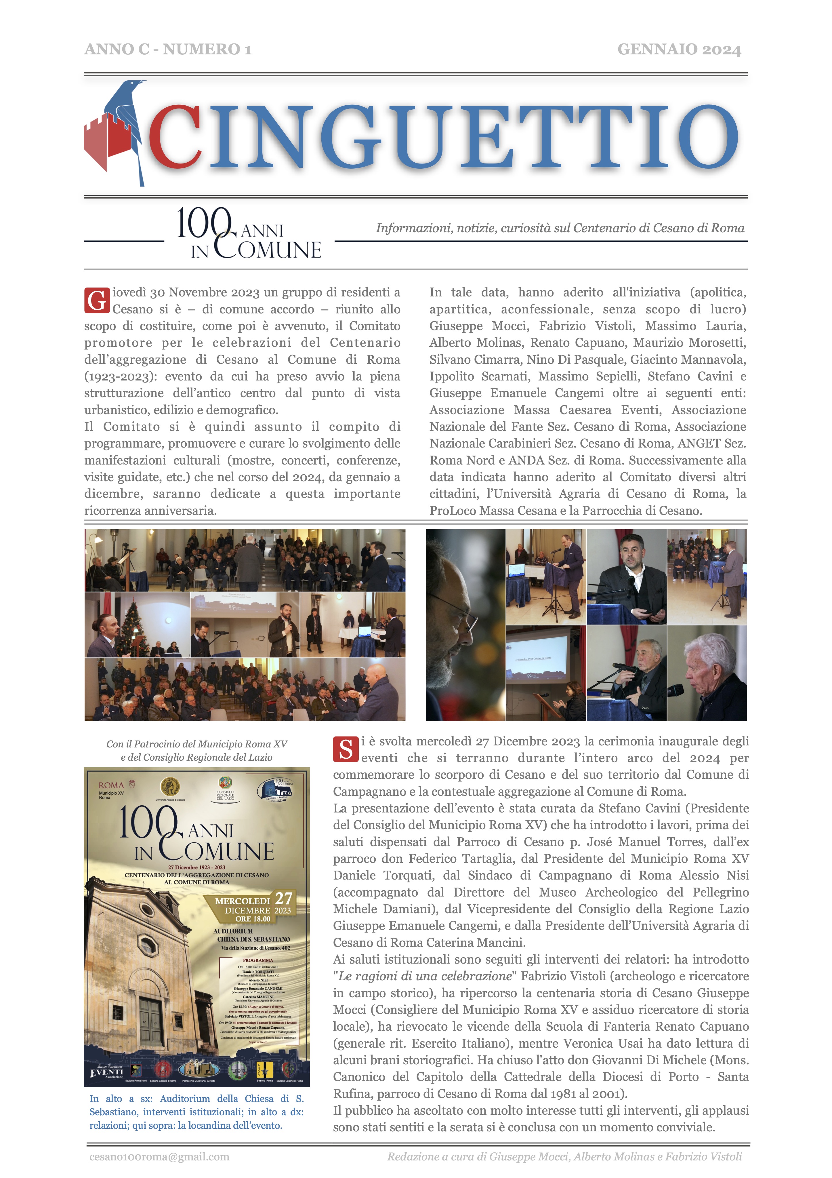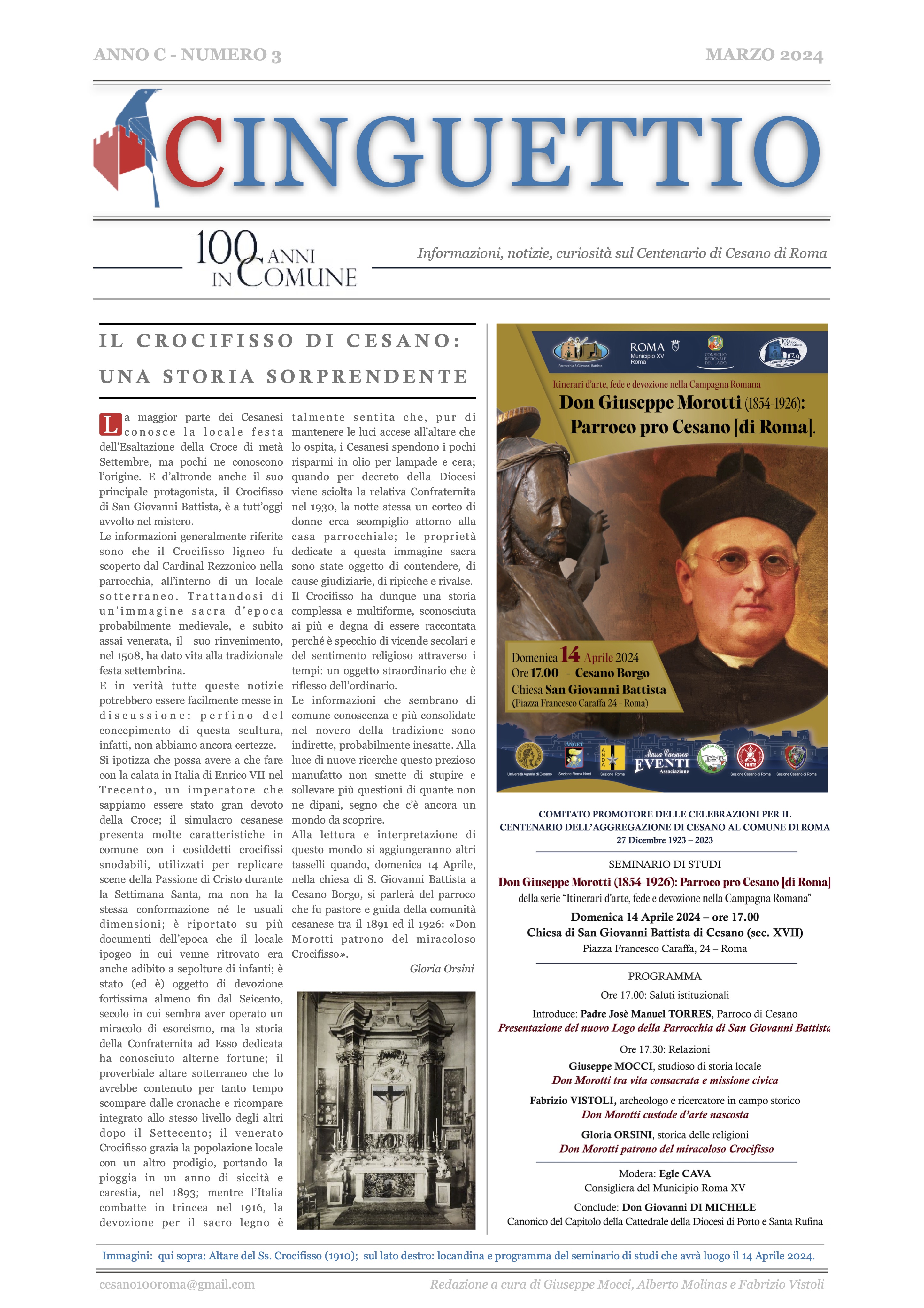 Il Comitato Promotore delle Celebrazioni per il Centenario dell'aggregazione di Cesano al Comune di Roma [27 Dicembre 1923-2023] ha diffuso il suo quinto numero di Cinguettio, ovvero quello di Marzo 2024, ufficialmente il numero 3, che segue il numero 0, il numero 1, il numero 2 e il numero speciale per la chiesa di San Nicola di Bari.