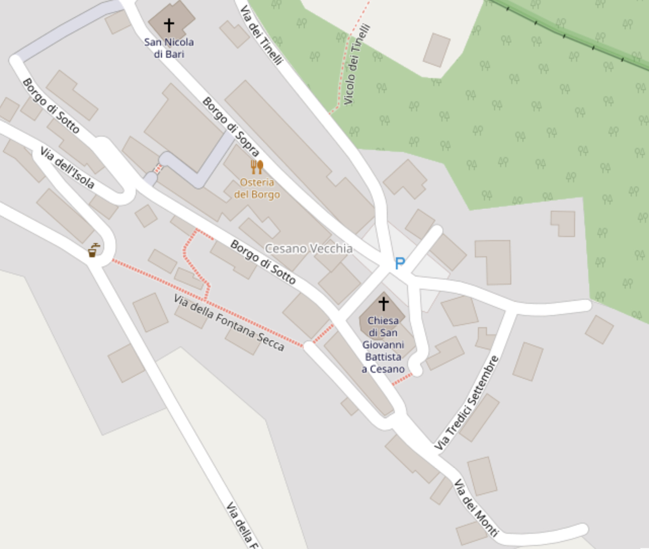 Il Borgo di Cesano è diviso in due da una via (Borgo di Sopra) che finisce in una piazza (Piazza Francesco Caraffa). Altre sono strade parallele o traverse e altro (Borgo di Sotto, Via della Fontana Secca, Via dell'Isola, Via dei Tinelli, Via XIII Settembre, Via dei Monti, Via Furcule e Via Cesanense), di cui alcune pedonali (Via Cortiliano, Piazza Padella e Via Mesopane) o parzialmente pedonalizzate spesso con scale (Via della Chiesa, Via della Fontana Secca e Borgo di Sotto, Vicoli – della Fontana Morta e della Fontana Secca – compresi); a queste si aggiungono le altre vie più o meno periferiche. Il centro storico di Cesano copre una superficie piccola, di circa 2 ettari e mezzo, tutto compreso, ovvero meno di 2 km di strade pavimentate con sampietrini (eccetto Via Cesanense e Via dei Tinelli).