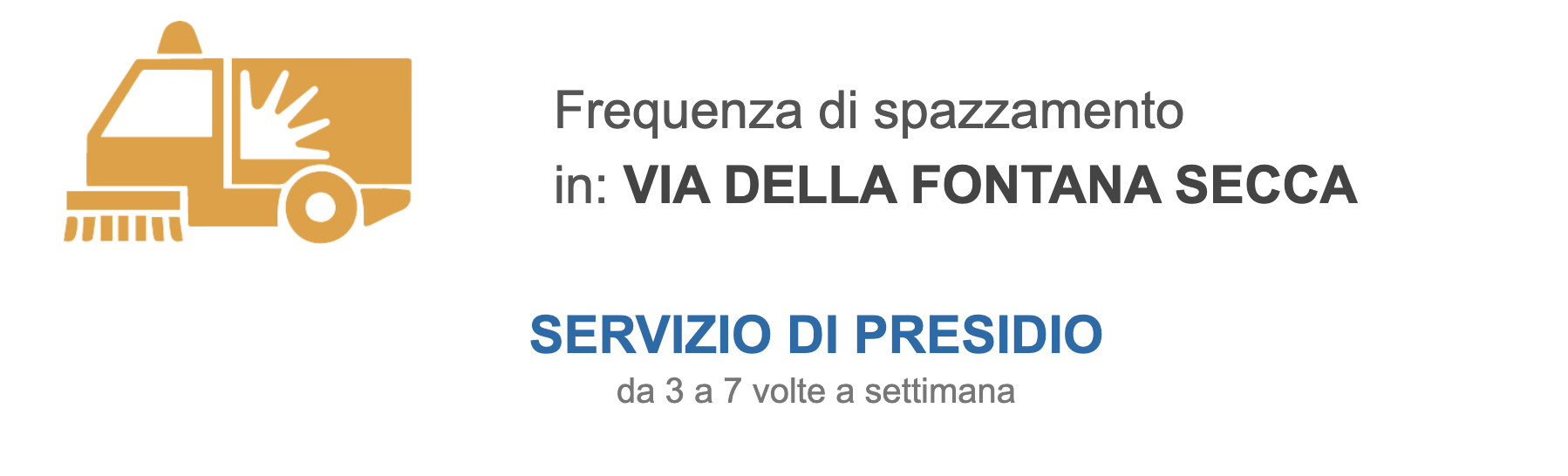 - Servizio di Presidio, è svolto di norma da un operatore con mezzo a vasca e consiste nella raccolta dei rifiuti in prossimità di postazioni di raccolta stradale (cassonetti e campane del vetro) e pulizia delle aree immediatamente circostanti, nonché nella pulizia di alcuni punti specifici caratterizzati da un’elevata frequentazione (fermate autobus, scuole, ecc.) Il servizio prevede anche la vuotatura dei cestini gettacarte presenti nel territorio assegnato e la pulizia intorno agli stessi;