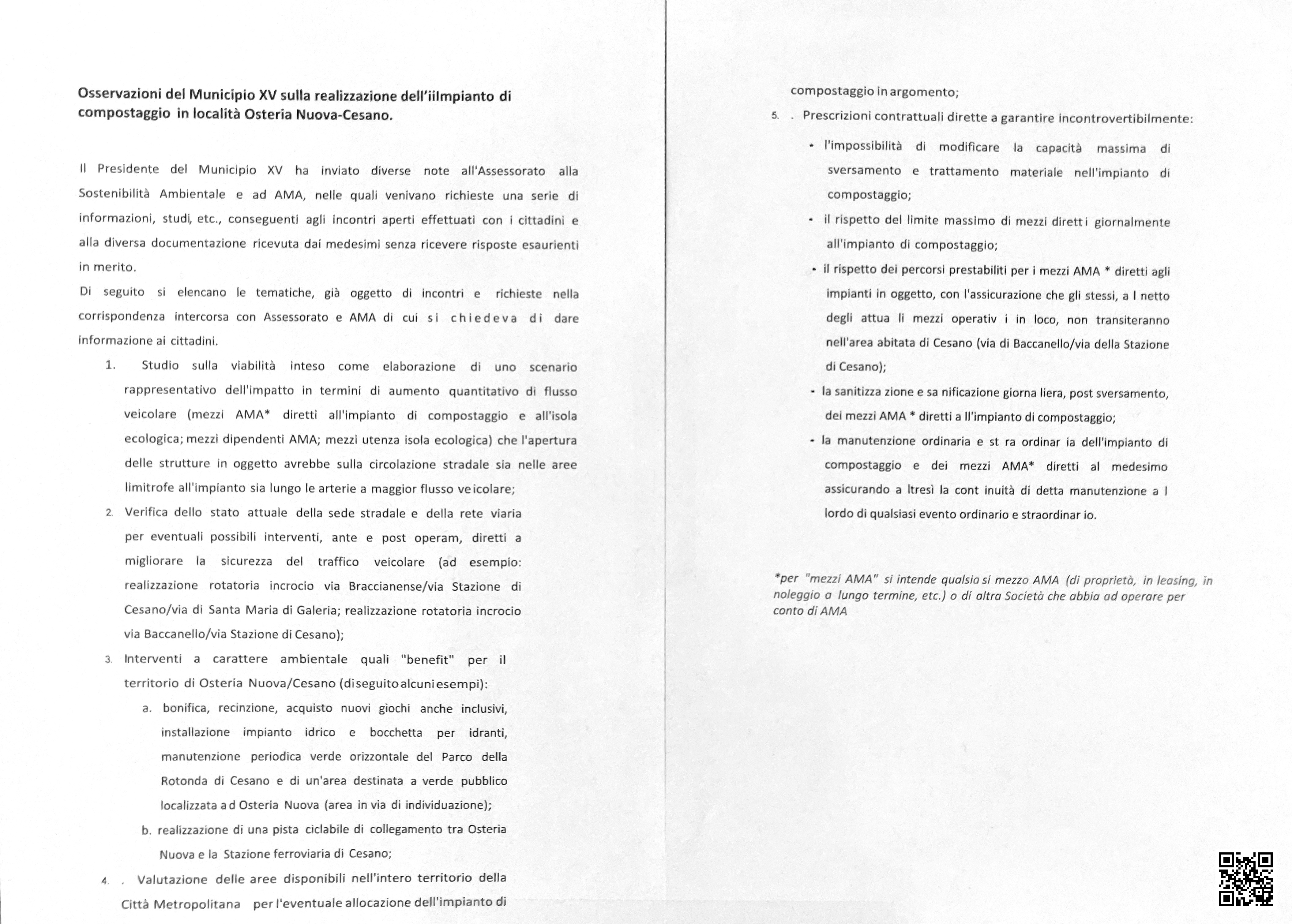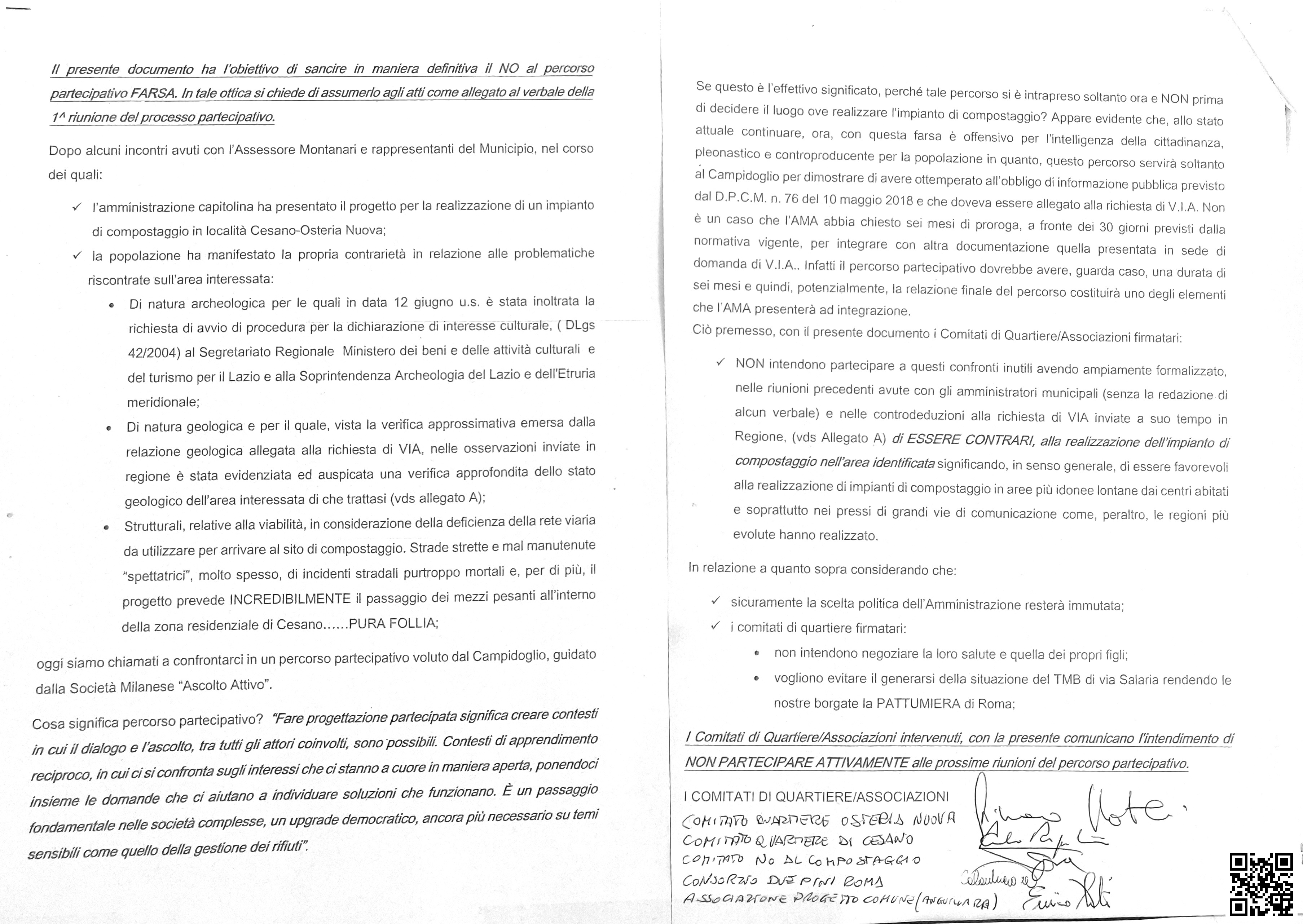 Nella galleria che si trova di seguito, volutamente, più incentrata su Cesano, c'è pure lo spazio dedicato alle ragioni del no del Comitato per il NO che, in data 23.10.2018 [nostro articolo] ha consegnato all'organizzazione per farla inserire tra la documentazione, salvo poi dichiarare di non accettare tale percorso e di non volerci partecipare, come d'altra parte è avvenuto (clicca qui per il documento). C'è anche la lettera con l'elenco di criticità e compensazioni che il Municipio Roma XV ha raccolto tra la popolazione durante le riunioni del 2017 (clicca qui per il documento).