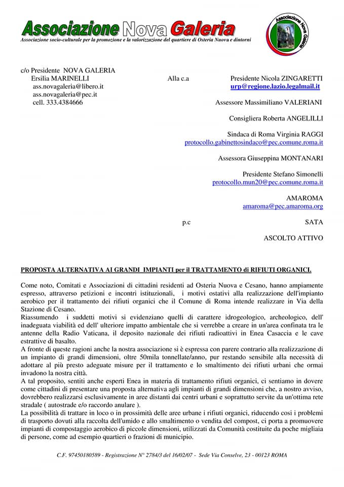 Come noto, Comitati e Associazioni di cittadini residenti ad Osteria Nuova e Cesano, hanno ampiamente espresso, attraverso petizioni e incontri istituzionali, i motivi ostativi alla realizzazione dell'impianto aerobico per il trattamento dei rifiuti organici che il Comune di Roma intende realizzare in Via della Stazione di Cesano.Riassumendo i suddetti motivi si evidenziano quelli di carattere idrogeologico, archeologico, dell' inadeguata viabilità ed dell' ulteriore impatto ambientale che si verrebbe a creare in un'area confinata tra le antenne della Radio Vaticana, il deposito nazionale dei rifiuti radioattivi in Enea Casaccia e le cave estrattive di basalto.A fronte di queste ragioni anche la nostra associazione si è espressa con parere contrario alla realizzazione di un impianto di grandi dimensioni, oltre 50mila tonnellate/anno, pur restando sensibile alla necessità di adottare al più presto adeguate misure per il trattamento e lo smaltimento dei rifiuti urbani che ormai invadono la nostra città.A tal proposito, sentiti anche esperti Enea in materia di trattamento rifiuti organici, ci sentiamo in dovere come cittadini di presentare una proposta alternativa agli impianti di grandi dimensioni che, a nostro avviso, dovrebbero realizzarsi esclusivamente in aree distanti dai centri urbani e soprattutto servite da un'ottima rete stradale ( autostrade e/o raccordo anulare ).La possibilità di trattare in loco o in prossimità delle aree urbane i rifiuti organici, riducendo cosi i problemi di trasporto dovuti alla raccolta dell'umido e allo smaltimento o vendita del compost, ci porta a promuovere impianti di compostaggio aerobico di piccole dimensioni, utilizzati da Comunità costituite da poche migliaia di persone, come ad esempio quartieri o frazioni di municipio.La politica agricola promossa da Roma Natura all'interno delle Aree protette (fig. 1), vedi DLgs 18 maggio 2011, n. 228 "Orientamento e modernizzazione del settore agricolo", la quale ha recentemente costituito un registro delle imprese multifunzionali, ci suggerisce la possibilità di includere tra queste anche imprese impegnate nella produzione di compost.Infatti, le numerose aziende agricole annesse ai parchi, potrebbero gestire attività di trattamento dei rifiuti organici provenienti dalle aree urbani nel raggio di alcune decine di km, dando vita cosi ad uno sviluppo sostenibile.Nello specifico del nostro territorio proponiamo di concordare con l'Azienda Agricola SATA, alla quale anni fa è stato espropriata l'area di circa 6 ettari inizialmente da destinare ai rottamatori e oggi individuata per l'impianto aerobico, uno scambio con un'area di circa 2/3 ettari a ridosso del depuratore Cobis, dove poter realizzare una Isola Ecologica ed ospitare al suo interno delle compostiere di comunità dal quale la stessa azienda e gli stessi cittadini possano prelevare il compost.I restanti 3 ettari di terreno, da cedere da parte della Sata, dovrebbero invece ricadere in prossimità del quartiere di Osteria Nuova per la realizzazione di un parco attrezzato con impianti sportivi ecosostenibili, che vada a compensare il disagio dovuto alla presenza dei rifiuti radioattivi e impianti nucleari in ENEA Casaccia (fondi CIPE - legge n.368/2003 di conversione del d.l.n.314/2033 - art.4 comma 1bis) La stessa Azienda Sata, che opera nell'area protetta di Galeria Antica, potrebbe inoltre adibire le proprie cascine abbandonate, come ad esempio quella adiacente al cimitero di S.Maria di Galeria, per allocare ulteriori compostatori dal quale poi ricavarne fertilizzante per le proprie culture.Ci riserviamo di approfondire con i tecnici del settore e gli organi preposti le soluzioni alternative qui accennate.Roma, 20/ 11/ 2018 Associazione NOVA GALERIA