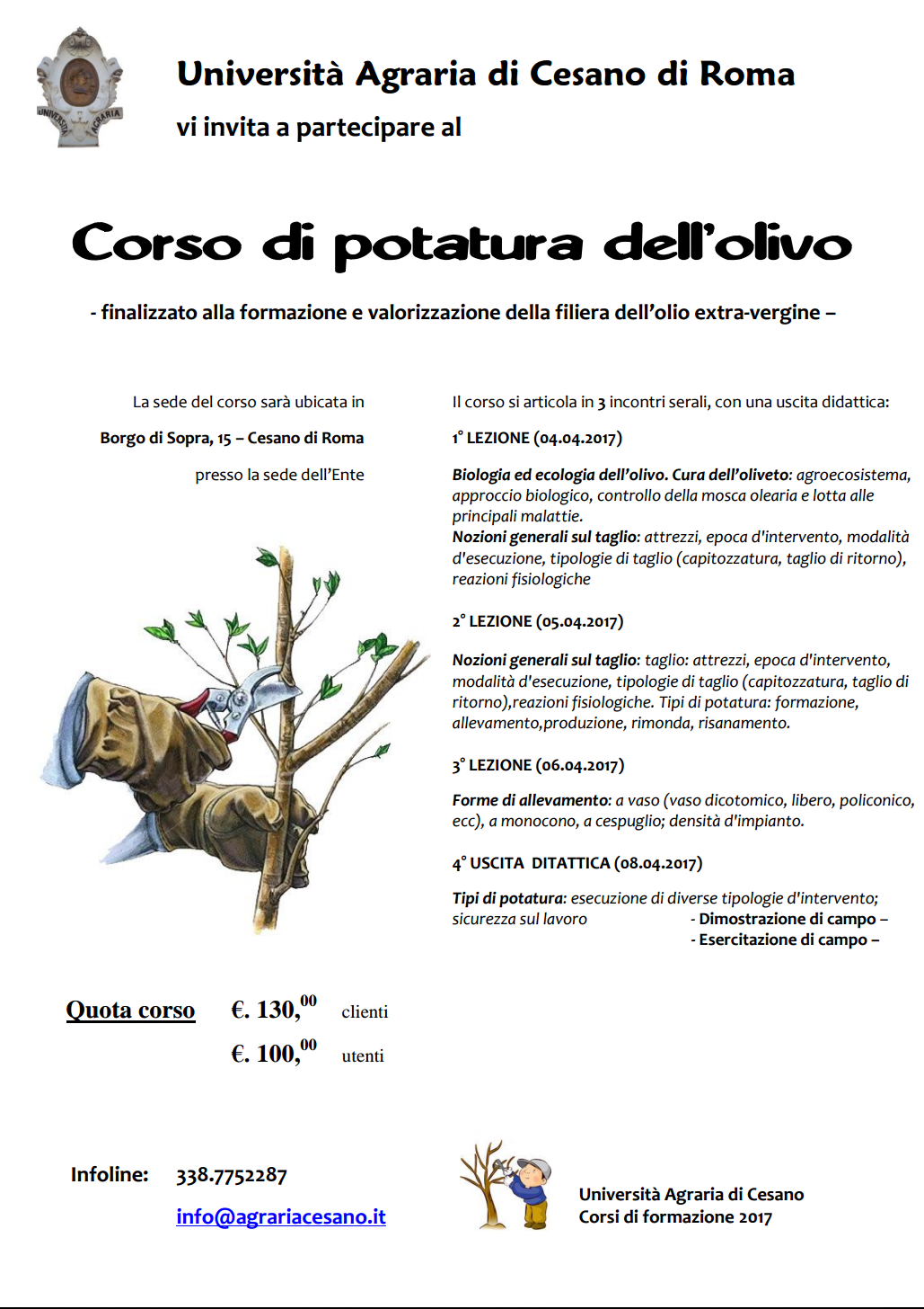 Inizia il 4 Aprile il prossimo corso di potatura dell'olivo organizzato dall'Università Agraria di Cesano di Roma. Saranno 4 le lezioni, tra teoria e pratica nei giorni 4, 5, 6 e 8 Aprile.