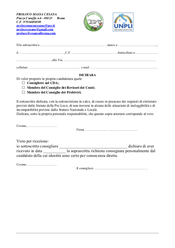 Come pubblicamente annunciato nella cena per il tesseramento del 6 aprile scorso il CDA della Pro Loco deve essere rinnovato.Stante ciò nella riunione del direttivo del 14 aprile è stata fissata la data delle elezioni a venerdì 8 giugno 2018 ore 16.00/20.00 presso l’oratorio della Chiesa di San Sebastiano.Il termine ultimo per la presentazione delle candidature è il 26/05/2018.Le candidature che saranno ricevute se consegnate per iscritto personalmente ad uno dei membri dell’attuale CDA che verifica l’iscrizione del candidato e rilascia ricevuta sottoscrivendo copia della richiesta, o tramite PEC all’indirizzo prolocomassacesana@pec.it o anche tramite mail agli indirizzi prolococesano@gmail.com o proloco@cesanodiroma.com in questo caso la candidatura dovrà essere confermata prima della data di elezione mediante sottoscrizione in presenza di un consigliere.Il CDA dovrà essere composto da:numero 7 consiglieri;numero 3 revisori dei conti;numero 3 probiviri; (per far parte di questo consiglio non è necessario essere soci della Pro Loco)Si rammenta che l’articolo 9 dello statuto recita:“Tutti i soci, iscritti da almeno trenta giorni, possono essere eletti. Saranno eletti coloro che hanno riportato il maggior numero dei voti.”Saranno ammessi al voto tutti i socio in regola con l’iscrizione e con il rinnovo per l’anno in corso.Roma: 03/05/2018Il consiglio Direttivo della Pro Loco Massa Cesana
