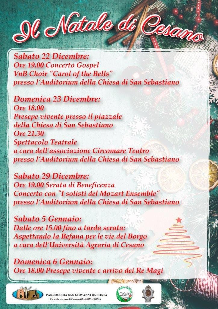 Un insieme di eventi a cura della Pro Loco Massa Cesana, dell'Università Agraria di Cesano di Roma e della Parrocchia di San Giovanni Battista di Cesano. Ecco a voi il programma de "Il Natale di Cesano" dei giorni 22 e 23 Dicembre, 29 Dicembre e 5 e 6 Gennaio.