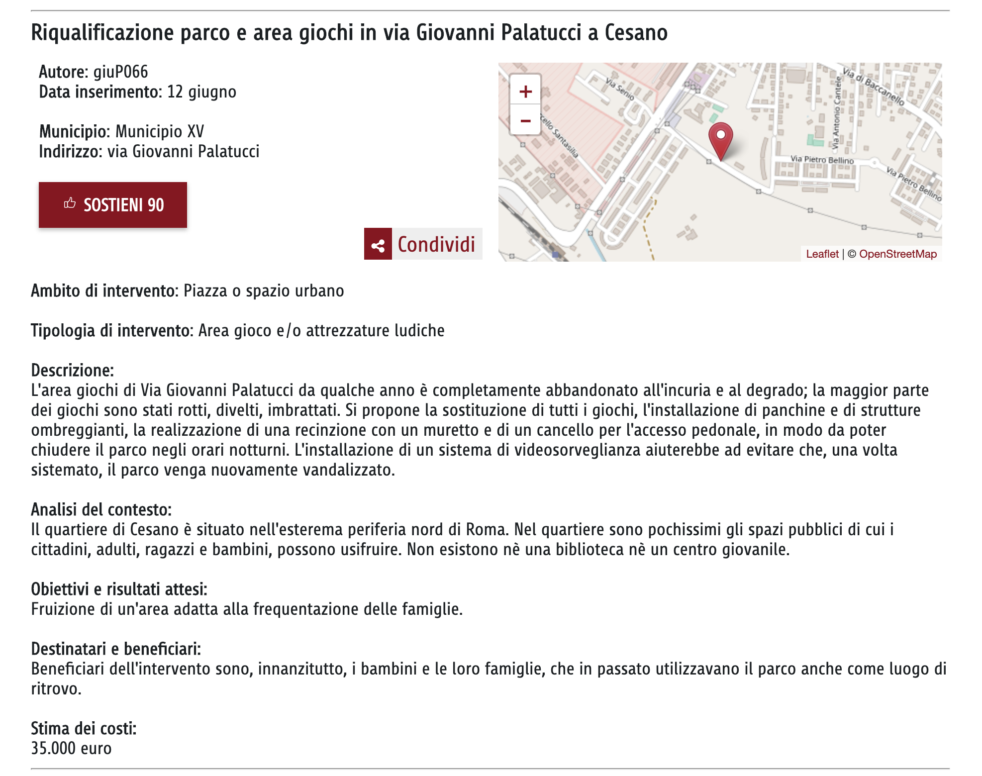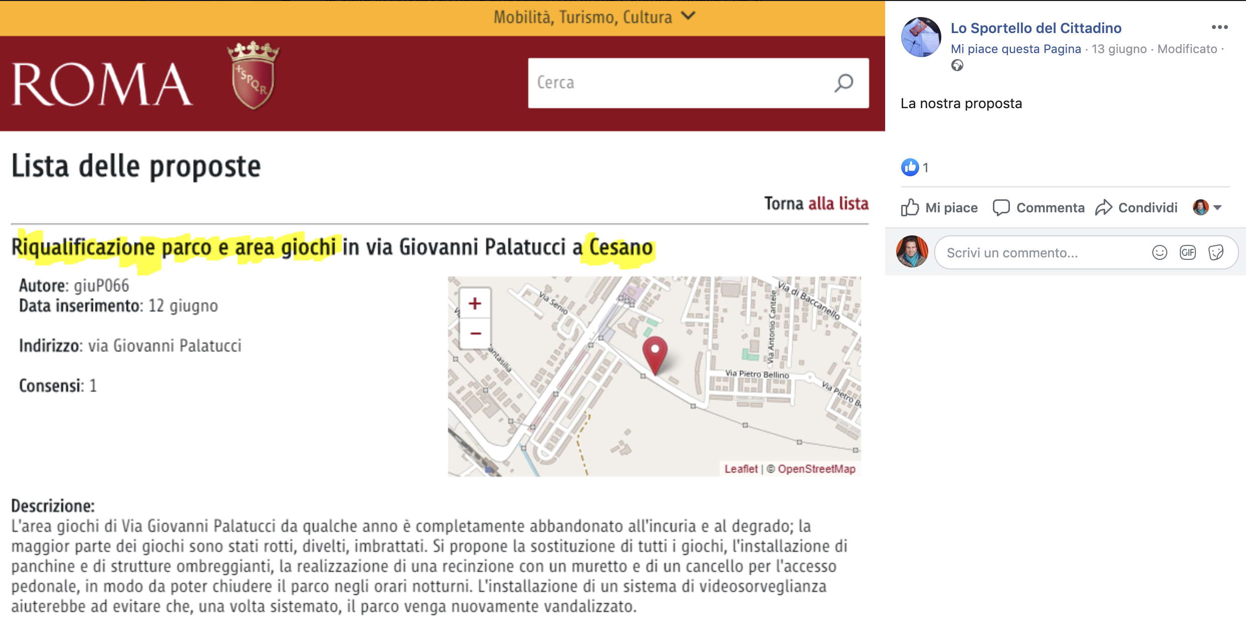 Dall'elenco di progetti presentati dalla cittadinanza risulta uno a Cesano scalo presentato da giuP066: "Riqualificazione parco e area giochi in via Giovanni Palatucci a Cesano" che al momento ha 90 sostenitori.