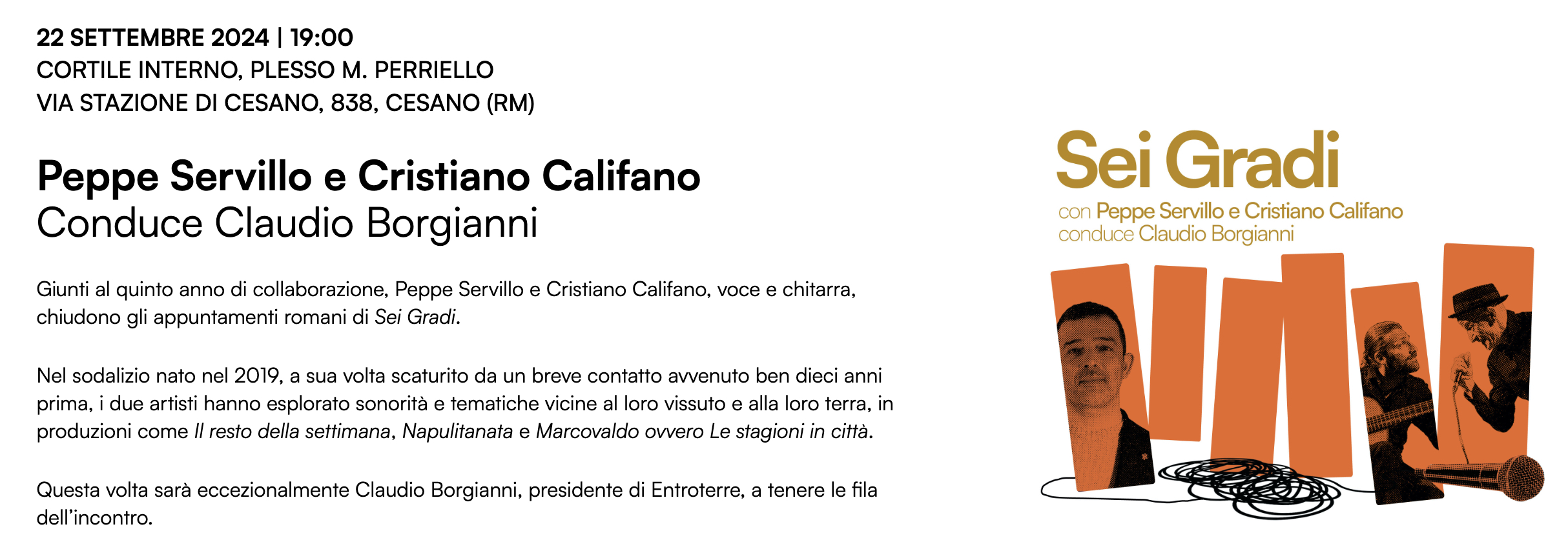 Sabato 21 e domenica 22 Settembre 2024 il teatro arriva a Cesano: il 21 alle 20.30, uno spettacolo teatrale itinerante per le vie dell'antico Borgo "Giordano Bruno. Alla luce delle stelle" regia di Lilith Petillo; il 22 alle 19.00, un breve concerto inserito nella cornice della Scuola Michele Perriello "Sei Gradi. Con Peppe Servillo e Cristiano Califano" conduttore Claudio Borgianni.