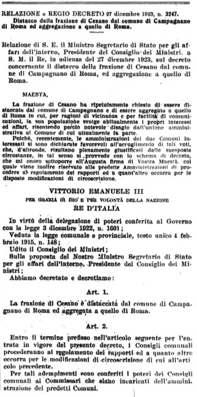 Distacco della frazione di Cesano dal comune di Campagnano di Roma ed aggregazione a quello di Roma.