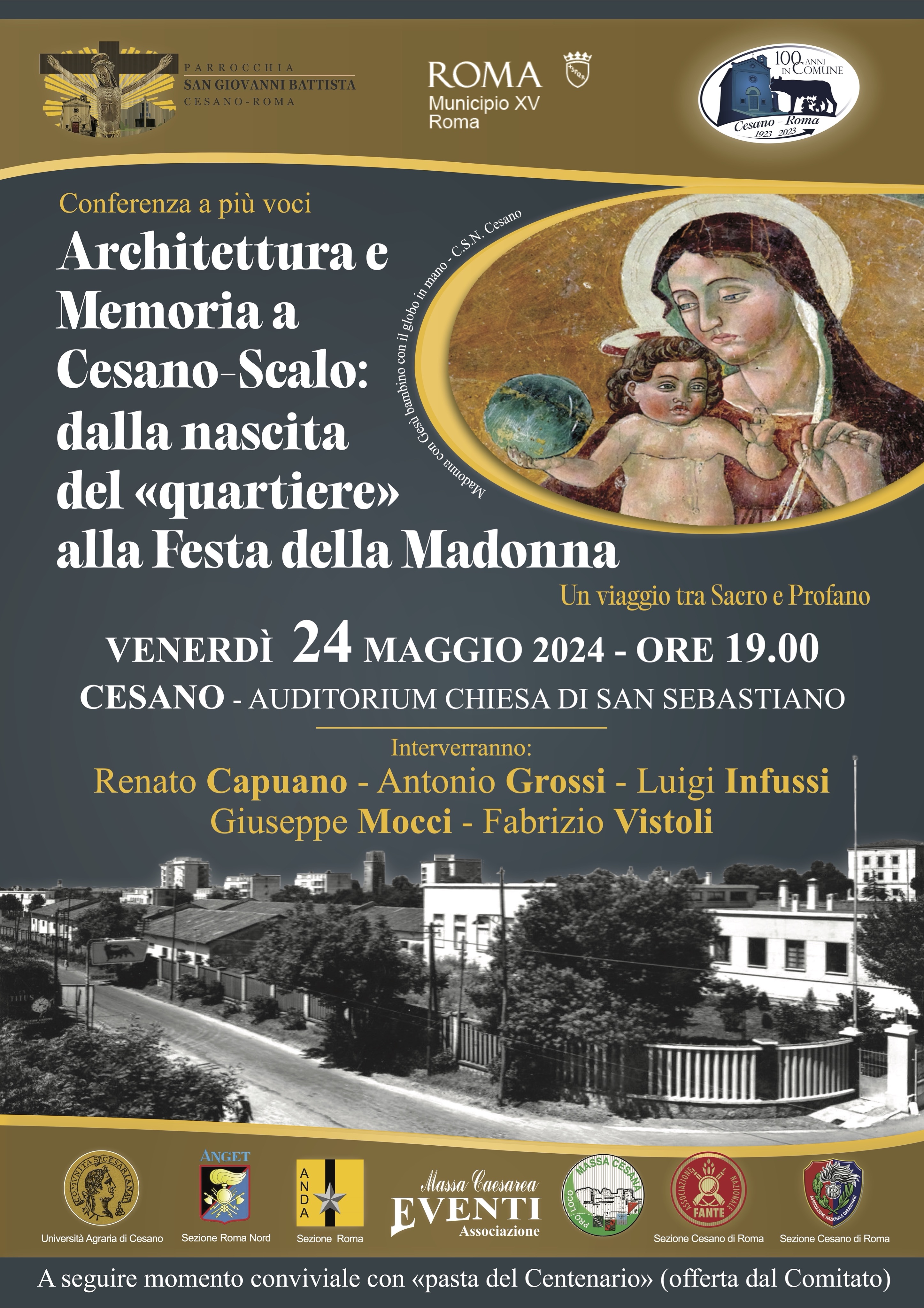 Interverranno Renato Capuano, Antonio Grossi, Luigi Infussi, Giuseppe Mocci e Fabrizio Vistoli per trattare di ciò che ha preceduto la Scuola di Fanteria (il Servizio Chimico Militare, il campo sfollati e la caserma), dello sviluppo urbanistico di Cesano Scalo, della Festa della Madonna del Rosario nella tradizione dei cesanesi e della Confraternita, e delle rappresentazioni artistiche della Madonna nel territorio di Cesano.