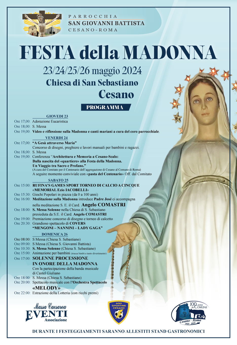 Tra le diverse attività che si stanno svolgendo per il Centenario di Cesano nel Comune di Roma, la prossima sarà una conferenza a più voci venerdì 24 c.m. (ingresso libero), coincidendo con i festeggiamenti che la Parrocchia ha organizzato nel mese dedicato alla Madonna insieme all'Associazione Massa Caesarea, l'ASD Cesano e concittadini volontari.