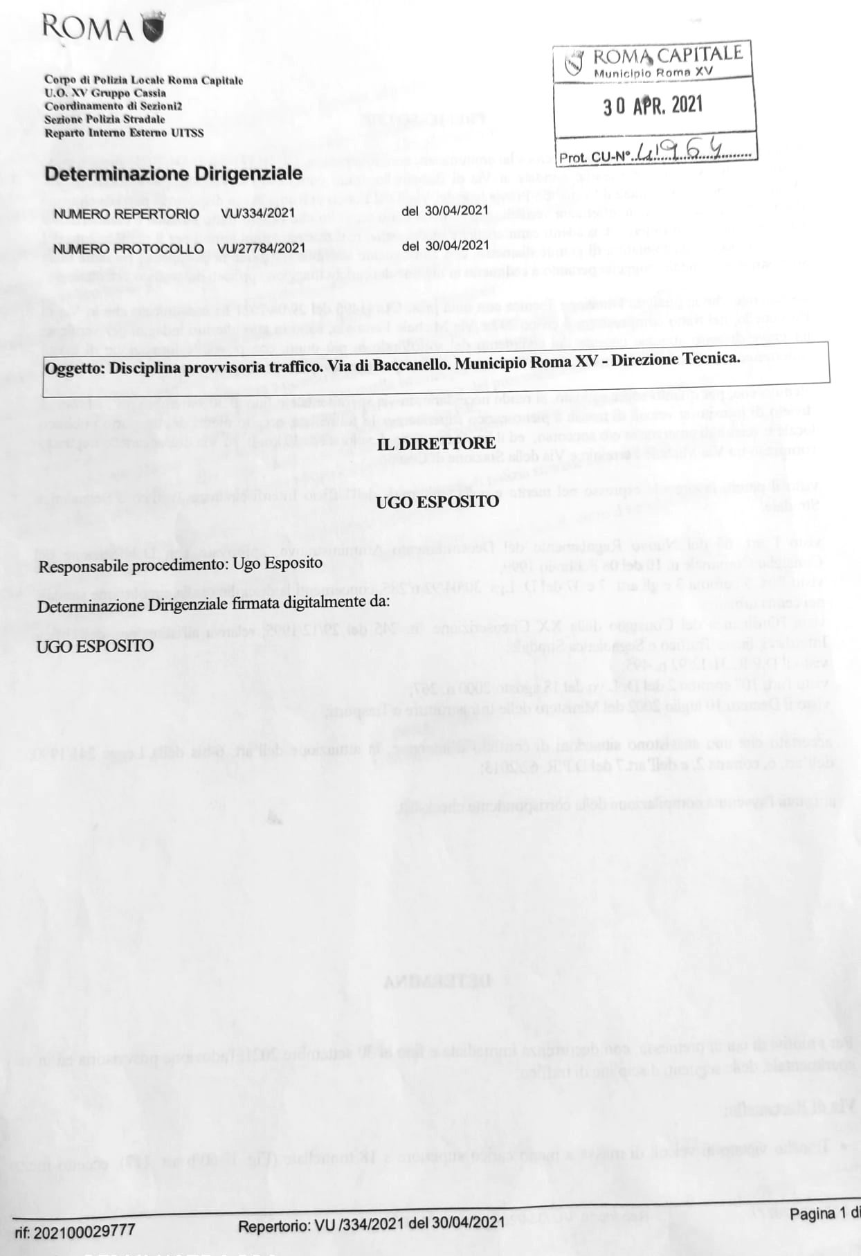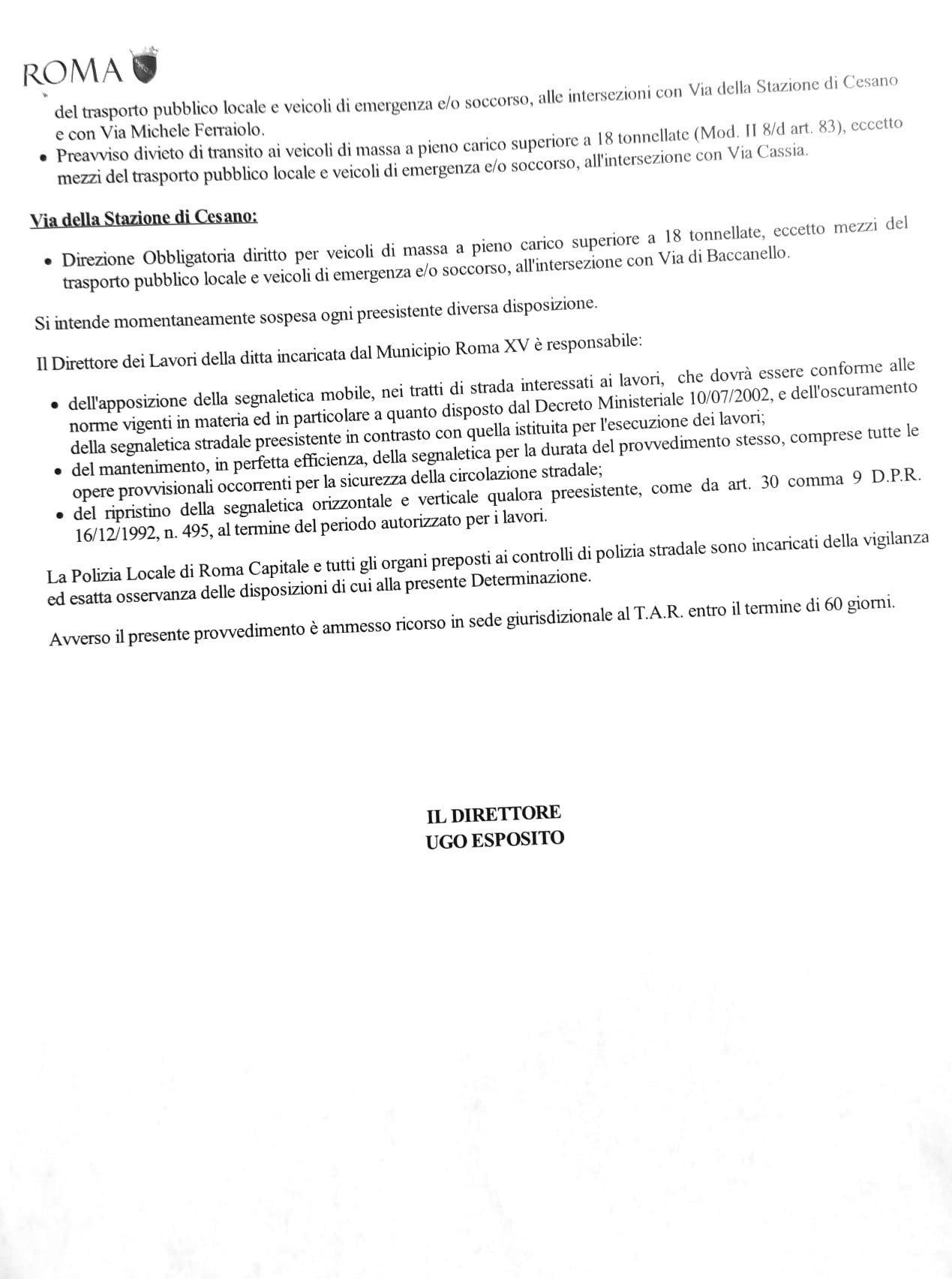 La predetta D.D. avrà effetto appena sarà installata dal Municipio Roma XV apposita segnaletica.