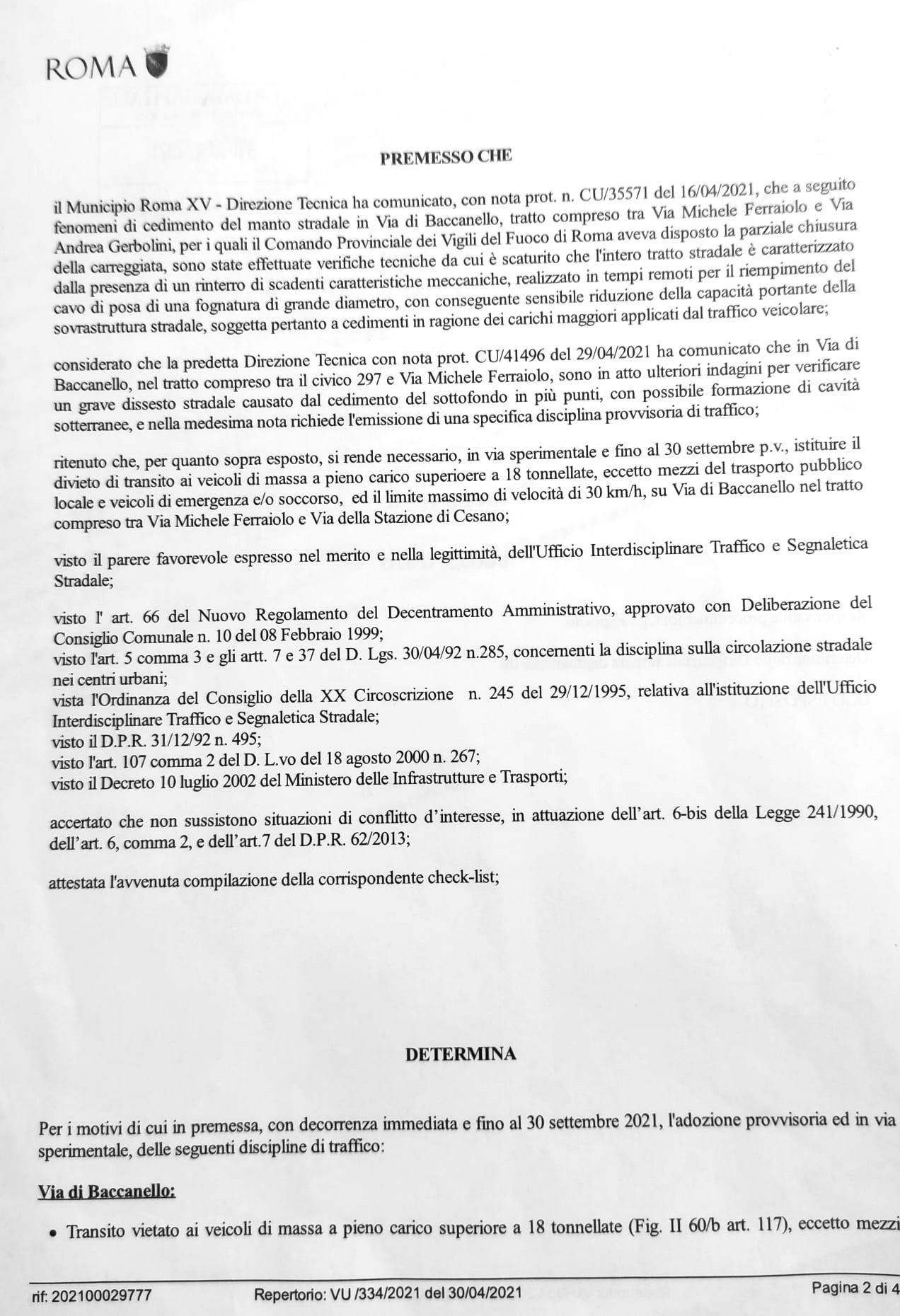 Transito vietato ai veicoli di massa a pieno carico superiore a 18 tonnellate, eccetto mezzi del trasporto pubblico locale e veicoli di emergenza e/o pronto soccorso, alle intersezioni con via della Stazione di Cesano e con via Michele Ferraiolo;