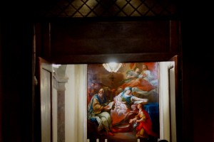 A sinistra, dietro il confessionale, si trovava una tela rappresentante la predicazione di S. Giovanni Battista, databile al XVIII secolo e proveniente dalla distrutta chiesa di S. Nicolò di Galeria. Nel 2006, in occasione del restauro della nostra chiesa, la tela fu staccata dalla parete e rivelò una sorpresa:al di sotto nascondeva un’altra tela, mai vista prima, raffigurante la Vergine in trono col Bambino, circondata da S. Lucia, S. Nicola, S. Antonio, S. Francesco e angeli.